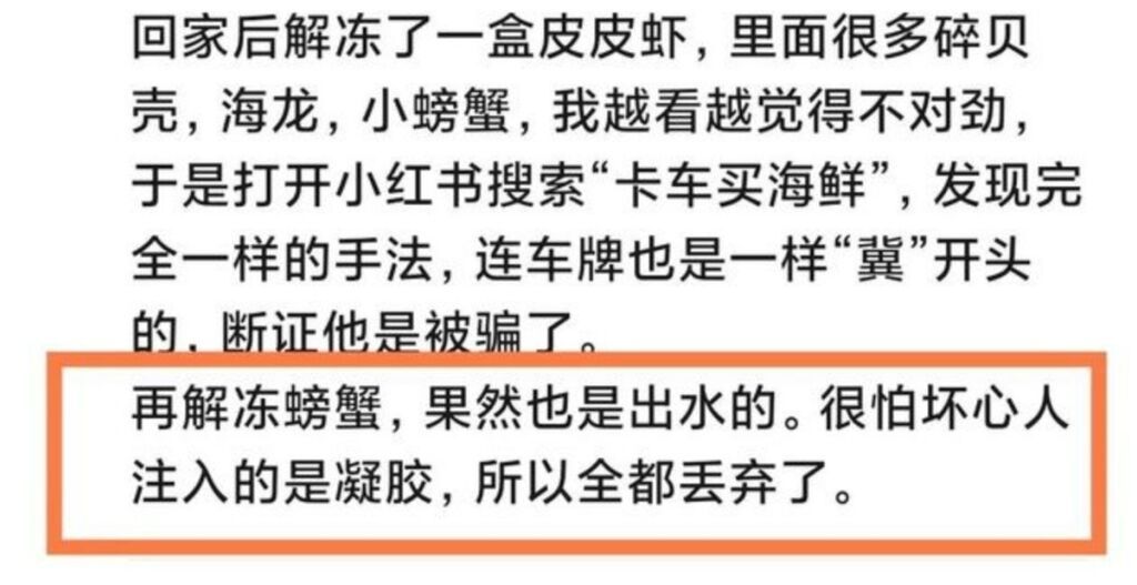这位市民回家以后,解冻了一盒皮皮虾,发现根本不是真的大号皮皮虾,里面藏着很多碎贝壳,八爪鱼、海龙和小螃蟹,再解冻螃蟹,果然是空壳蟹。