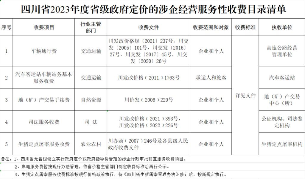 近日,四川省发展改革委发出通知公布了《四川省2023年度政府定价的经营服务性收费目录清单》、《四川省2023年度省级政府定价的涉企经营服务性收费目录清单》。四川省2023年度政府定价的经营服务性收费主要包括交通服务收费、公共事业服务收费、其他特定服务收费三大类别,每个类别又分一、二级项目,其中一级收费项目共12个,每项目收费公布了收费标准。