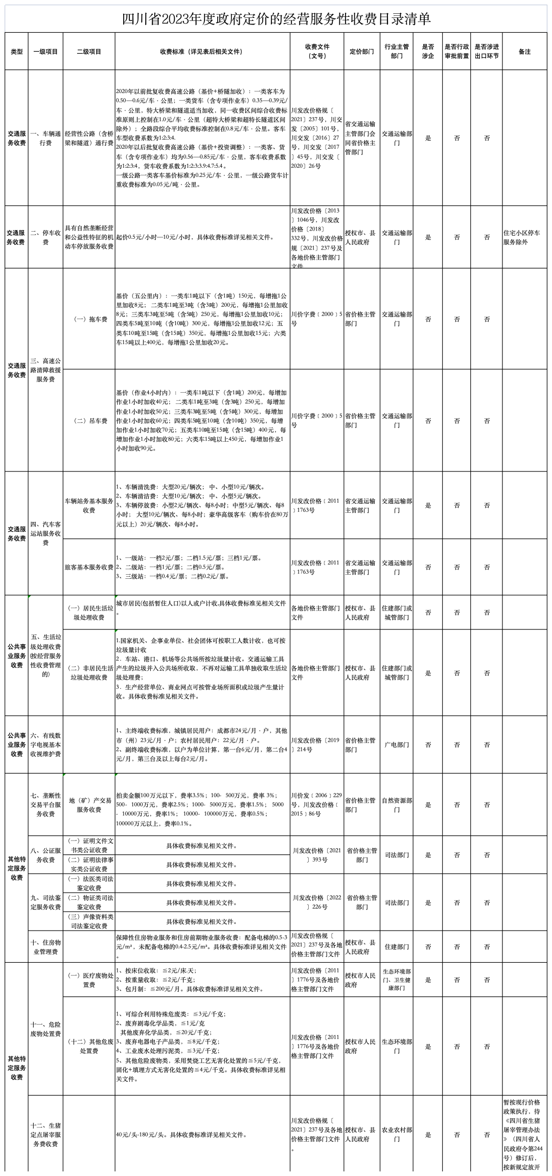 《四川省2023年度政府定价的经营服务性收费目录清单》