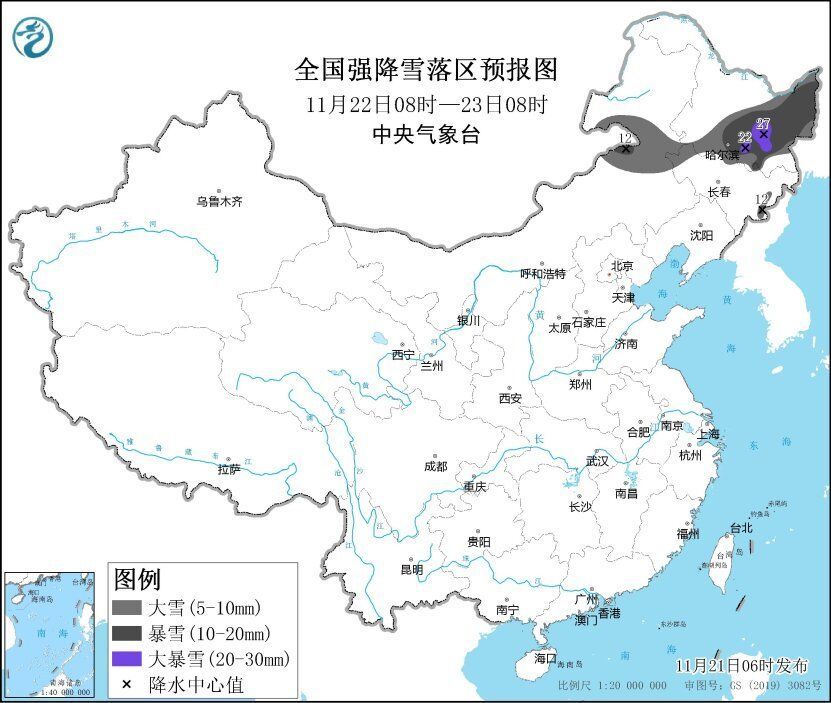 预计,11月21日08时至11月23日08时,内蒙古东部、黑龙江中东部、吉林长白山区等地的部分地区有大到暴雪,局地大暴雪,累积降雪量将有8~20毫米,局地可达20~30毫米,新增积雪深度6~15厘米,局地可达20厘米左右。主要降雪时段为21日夜间至22日。