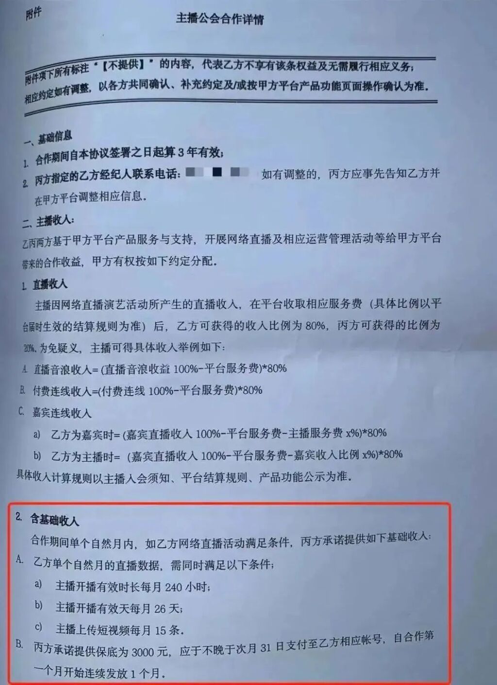 《协议》规定,主播每月保底收入3000元,但要求开播有效时长需达到每月240小时、开播有效天数达到每月26天、主播上传短视频每月15条。