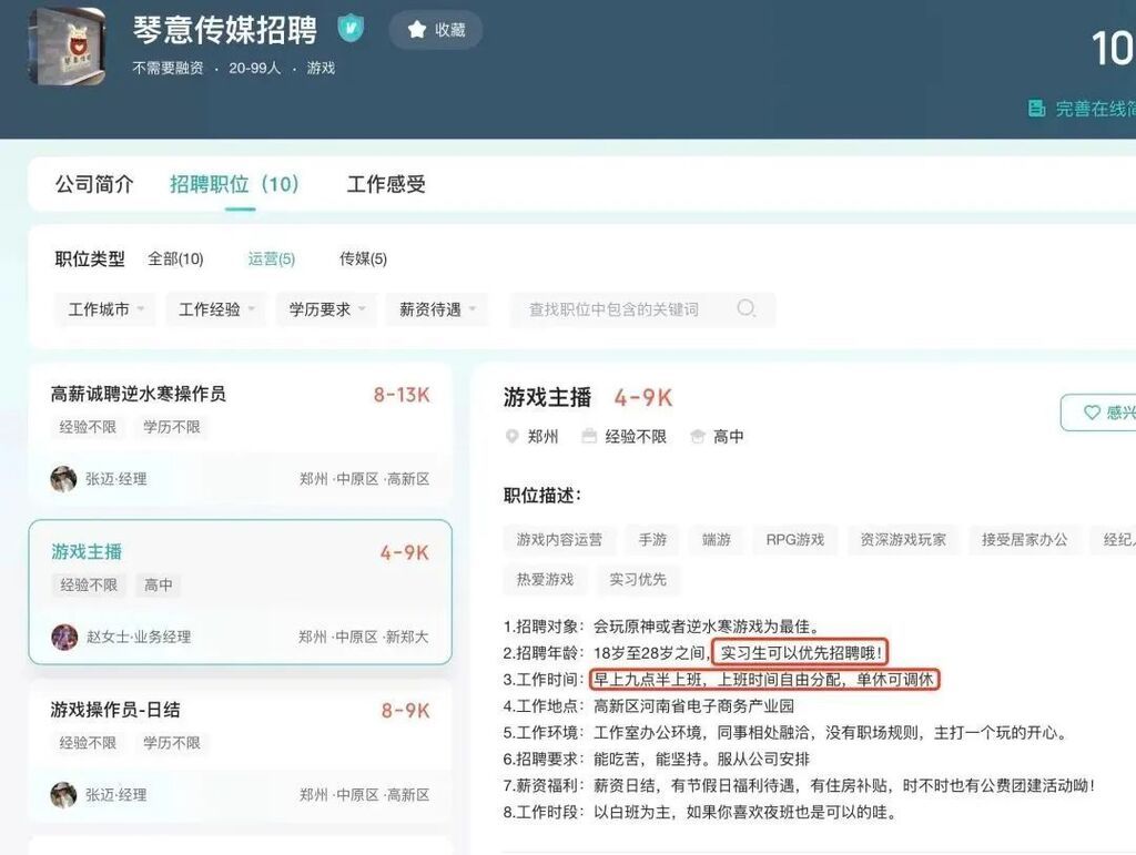 在网上搜索该公司,可以看到不少招聘信息。在某招聘网站上,该公司发布了10条招聘信息。其中招聘“游戏主播”的信息显示,薪资4000-9000元、经验不限,要求会玩部分游戏为最佳,招聘年龄上还注明“实习生可以优先招聘”。在工作时间上,该公司称“早上九点半上班,上班时间自由分配,以白班为主……”