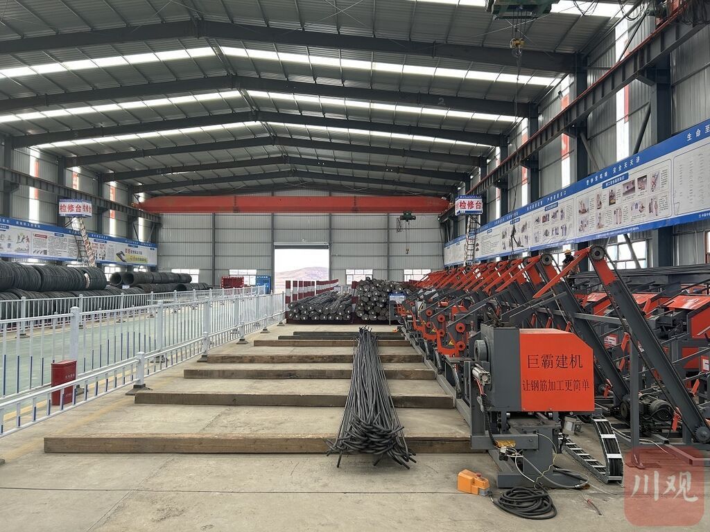 钢筋生产车间外墙上,“高寒缺氧不怕苦,万众一心谱新篇”的标语醒目。刚到车间门,就听到了金属切割、吊机运行等交织的“施工奏鸣曲”。偌大的厂区看不到几个工人,钢筋拉直、切割、网片焊接等都由机械完成。