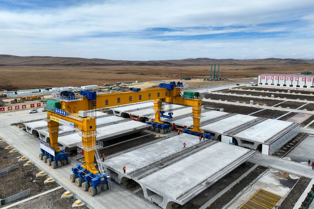 这是个占地146亩的方形场地。“这里地处草原湿地,表层覆盖了4米多厚的腐殖土,物体放在上面就沉。”制梁场副总工蔡飞介绍,项目团队今年2月进场后,用2个月时间清理了38.9万方腐殖土,再回填、打混凝土,才建成了梁场。