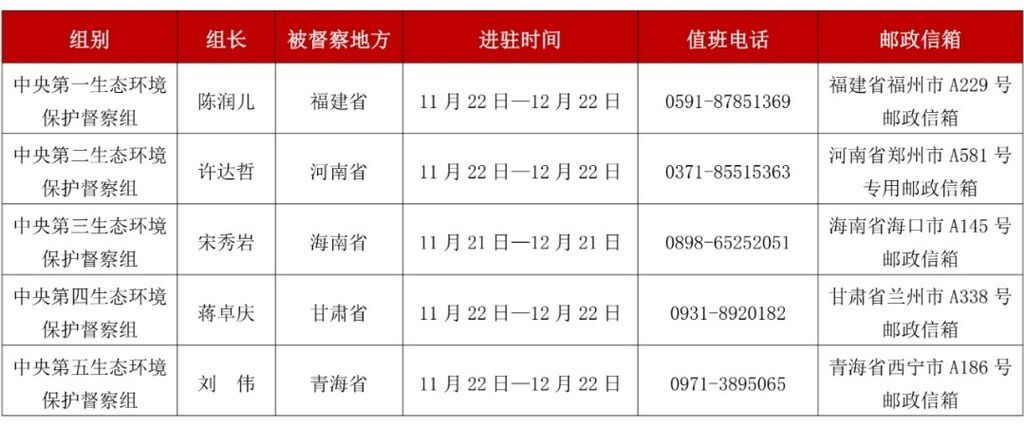 根据工作安排,第三轮第一批中央生态环境保护督察进驻时间为1个月。进驻期间,各督察组分别设立专门值班电话和邮政信箱,受理被督察地方生态环境保护方面的来信来电信访举报,受理举报电话时间为每天8:00—20:00。督察组全体成员将严格执行纪律要求,接受被督察地方和社会监督。在后续工作中,将严格落实中央有关要求,进一步为基层减负,简化程序、优化流程,不断提高督察工作的精准性、针对性,确保有序有效完成督察任务。