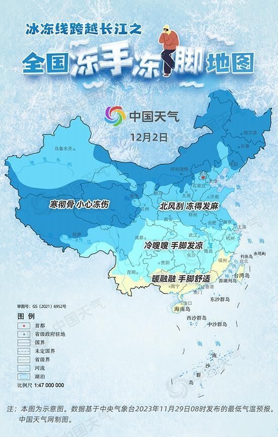 时值11月末,又到了“冻手冻脚”的时节了,网友纷纷调侃:“手脚外露一分钟,化冻需要一小时。”昨天(11月29日),一股较强冷空气再次“发货”,今明天中东部多地气温将再刷新今年下半年新低,东北、内蒙古等部分地区最低温可跌至-15℃以下,冰冻线或抵达江南北部。中国天气网推出全国冻手冻脚地图,看哪里将体验寒彻骨,要防冻伤。