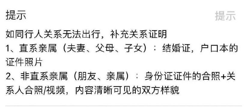 她提供的截图显示,平台要求“如非直系亲属(朋友、亲属)同行人无法出行,应提供身份证证件的合照,以及与关系人的合照或视频”。