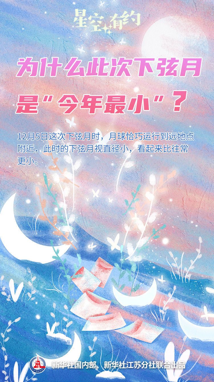 公元2023年的上弦月和下弦月各出现12次。12月5日月球经过远地点,当日出现的下弦月是本年度离地球最远的一次。为什么此次下弦月是“今年最小”?王科超表示,12月5日这次下弦月时,月球恰巧运行到远地点附近,此时的下弦月视直径小,看起来比往常更小。
