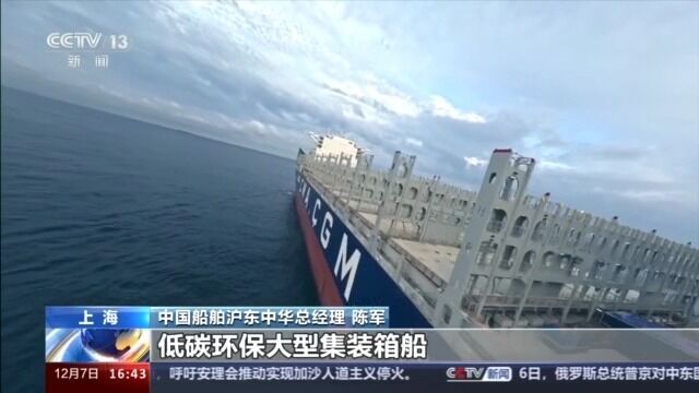 中国船舶沪东中华总经理 陈军:这艘船采用LNG作为动力燃料,又使用了智能除废气的装置,甲烷逃逸可以减少50%,二氧化碳的排放可以减少28%,是当今世界上最先进的低碳环保大型集装箱船。