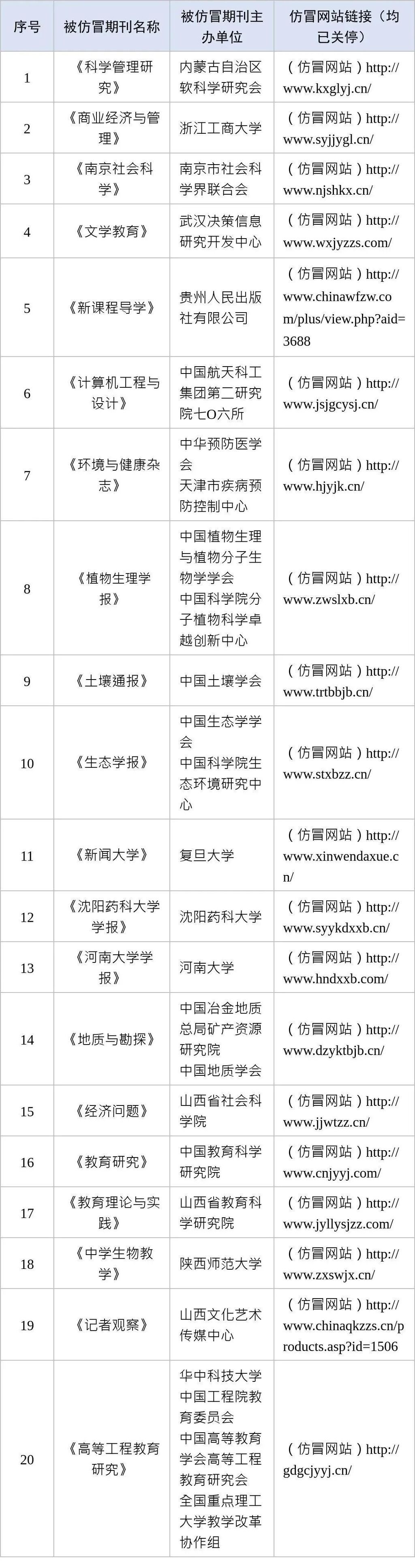 近日,中央网信办举报中心根据网民举报线索,会同相关部门依法受理处置一批仿冒学术期刊诈骗网站。这些仿冒网站页面与国内一些高等院校、科研院所等主管主办的学术期刊网站页面内容相似性很高,并冒用其名义对外发布约稿通知,诱骗作者投稿,借机收取所谓“审稿费”“版面费”敛财牟利,严重侵害网民合法权益,扰乱正常学术论文出版秩序。现公布一批仿冒诈骗网站名单,请广大网民提高警惕,注意辨别,避免上当受骗。