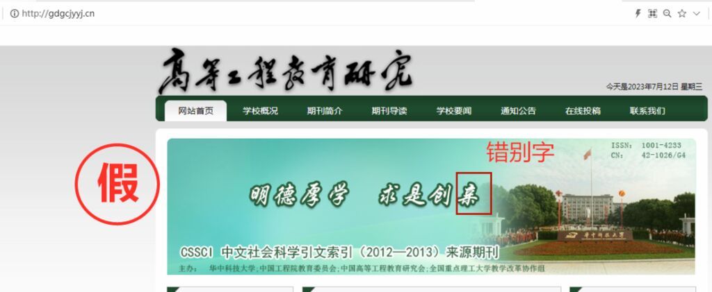 有的仿冒网站内容粗糙、错误明显,如期刊《高等工程教育研究》的仿冒网站将“求是创新”错写为“求是创亲”。