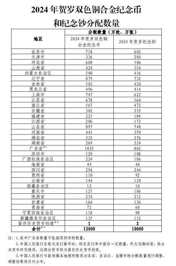 各省、自治区、直辖市双色铜合金纪念币和纪念钞分配数量如下: