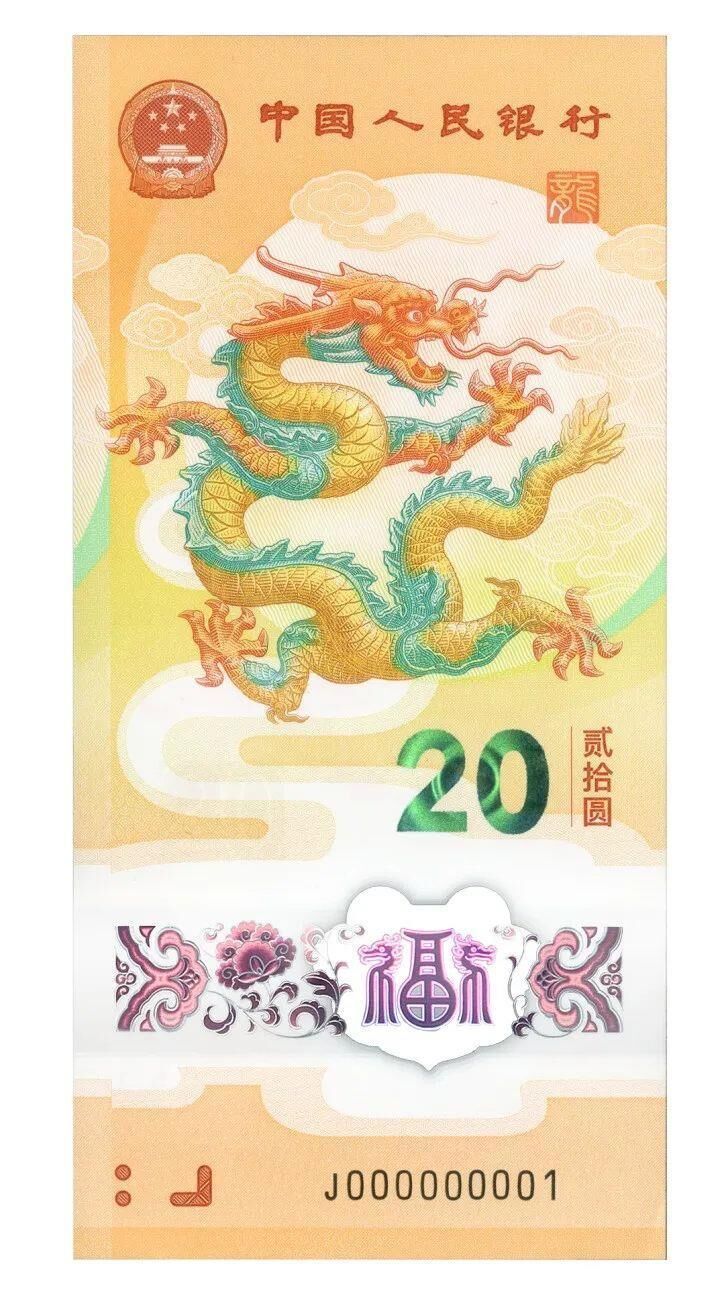 纪念钞正面主景为龙的造型图案,上方为中华人民共和国国徽、“中国人民银行”、篆书“龙”字印章,下方依次为光彩光变面额数字“20”与汉字“贰拾圆”、动感全息图案、透明视窗、盲文面额标记和冠字号码。