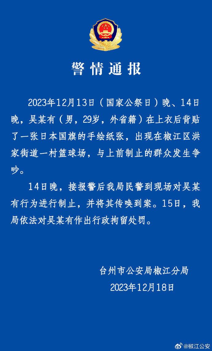 央视网消息:据@椒江公安 微博消息,浙江省台州市公安局椒江区分局18日发布警情通报,12月13日(国家公祭日)晚、14日晚,吴某有(男,29岁,外省籍)在上衣后背贴了一张日本国旗的手绘纸张,出现在椒江区洪家街道一村篮球场,与上前制止的群众发生争吵。