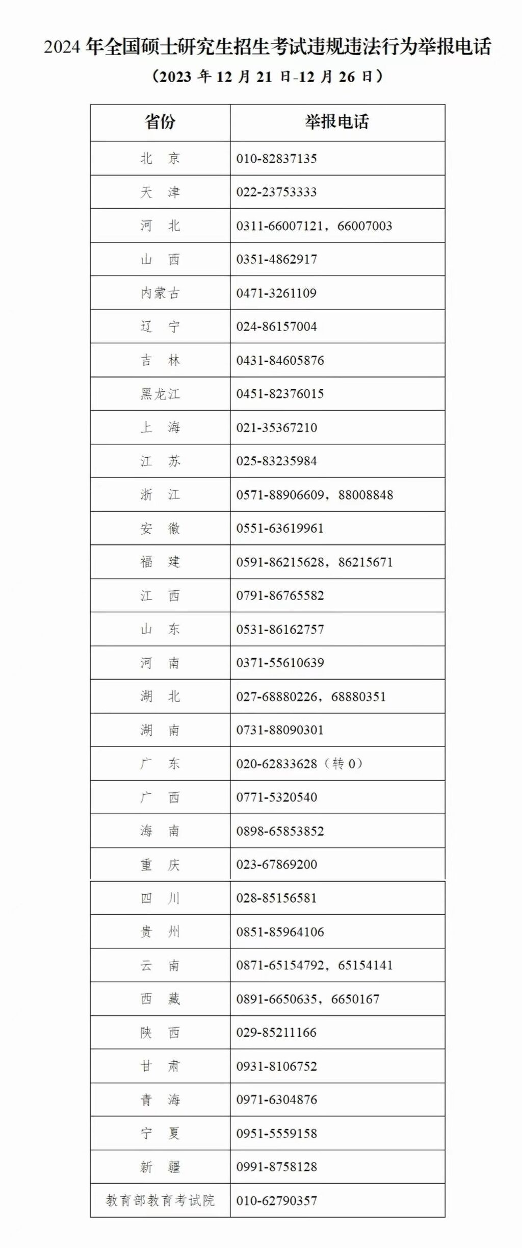 教育部和各省(区、市)教育招生考试机构将开通2024年研考举报电话,欢迎广大考生及社会各界人士及时举报反映有关问题线索。教育部及各省(区、市)将会同有关部门根据举报线索第一时间核查处理,坚决维护风清气正的研考环境。