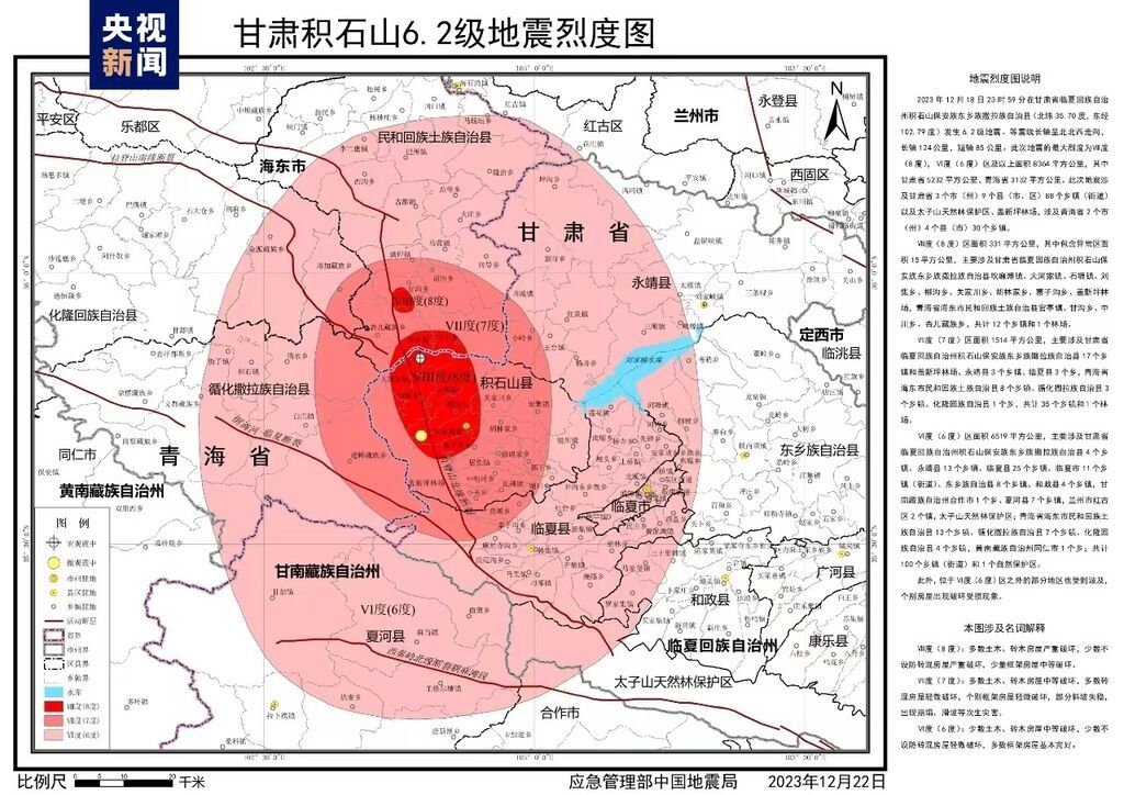 12月18日23时59分,甘肃临夏州积石山县发生6.2级地震。地震发生后,应急管理部组织中国地震局派出地震现场工作队,依照《地震现场工作:调查规范》(GB/T 18208.3-2011)、《中国地震烈度表》(GB/T 17742-2020),对灾区668个调查点展开了实地震害调查,并充分参考震区断裂构造、仪器烈度、余震分布、震源机制、遥感等科技支撑成果,确定了此次地震的烈度分布,完成了《甘肃积石山6.2级地震烈度图》编制工作,现正式向社会发布。
