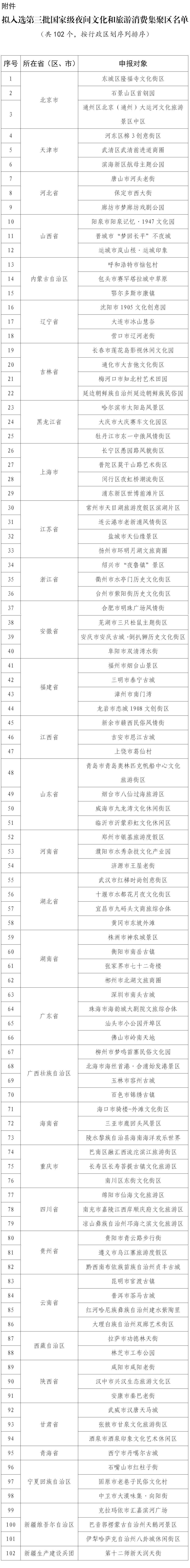 根据《文化和旅游部办公厅关于开展第三批国家级夜间文化和旅游消费集聚区建设工作的通知》(办产业发〔2023〕151号),经地方申报、省级文化和旅游行政部门推荐、合规性审查、专家评审、舆情风控、实地考察等程序,拟确定北京市东城区隆福寺文化街区等102个项目为第三批国家级夜间文化和旅游消费集聚区,公示名单如下: