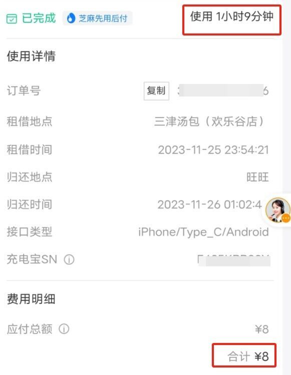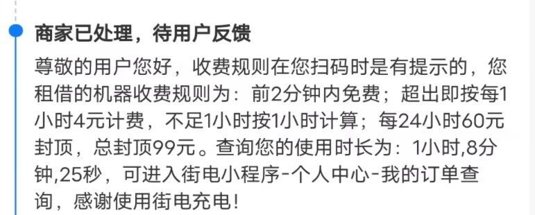 之后曾先生又租借了一个街电品牌的共享充电宝,归还后显示使用时长是1小时9分钟,扣费8元。曾先生感到不公平:“按规则我的两笔订单都显示1个多小时,为什么第一笔扣了6元,第二笔却扣了8元,租借时间短的收费反而更贵?”曾先生对记者表示,当天他还通过支付宝进行投诉,但事情依然没有得到解决。