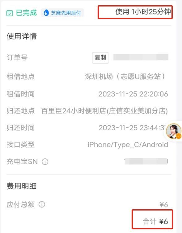 “11月25日,我在深圳机场用支付宝扫码租借了一个街电品牌的共享充电宝,用了不到半小时就没电了,当时附近没柜机无法及时归还,但充电宝订单却还在持续计费。”曾先生对记者说,他归还充电宝后,显示使用时长是1小时25分钟,扣费6元。曾先生表示:“只充电半小时,却按照1小时甚至更久的时间扣款,我不认可这些费用。”