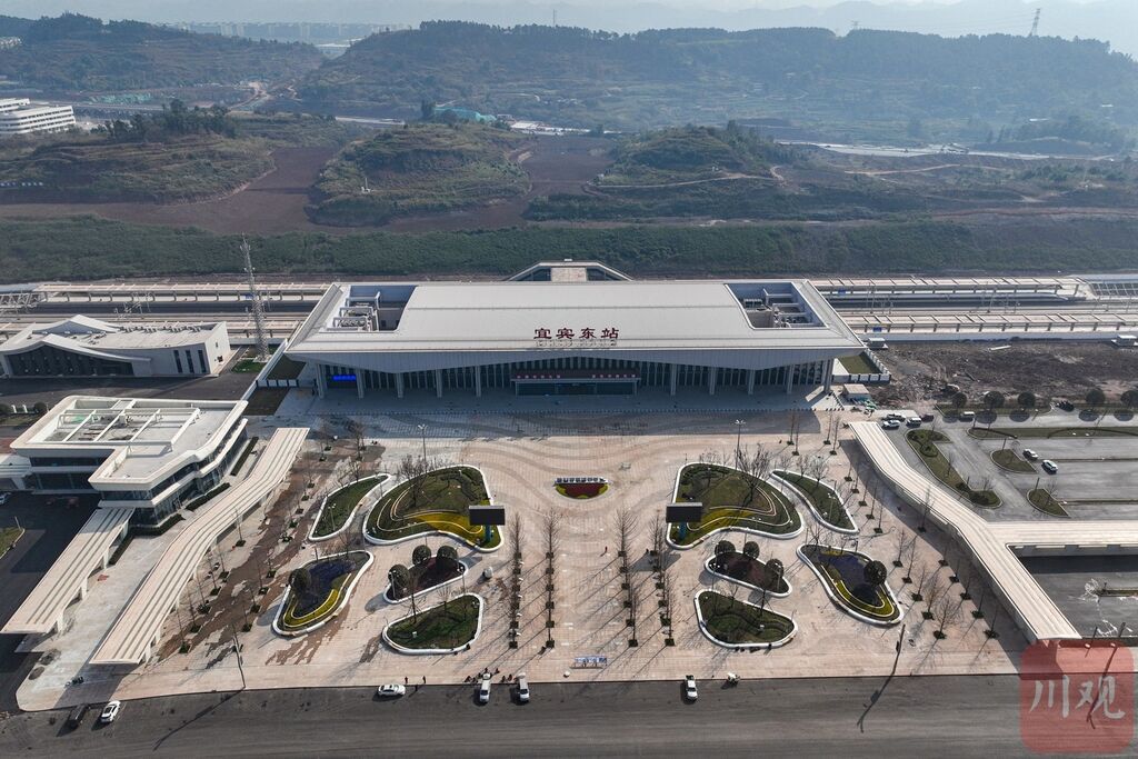 宜宾东站位于宜宾三江新区境内,总建筑面积1万平方米,为线侧上式站房,站场规模2台6线。站房建筑形式独具匠心,现代感十足,稳重大气。据中铁九局成自宜站房项目部副总工程师李连通介绍,外立面造型的起伏好似层叠的山峦,与三江新区周边的大片丘陵相呼应,并且使站房形象磅礴、大气,又不失现代科技感。立面上的三个门斗象征着从山中奔腾又在临港交汇的三江,在满足时尚前卫的条件下体现了地方特征。细部处理充分融入科技感十足的视觉元素,寓意着“三江新区”如科技雄鹰般振翅欲飞,崛起的坚定信念和美好憧憬。