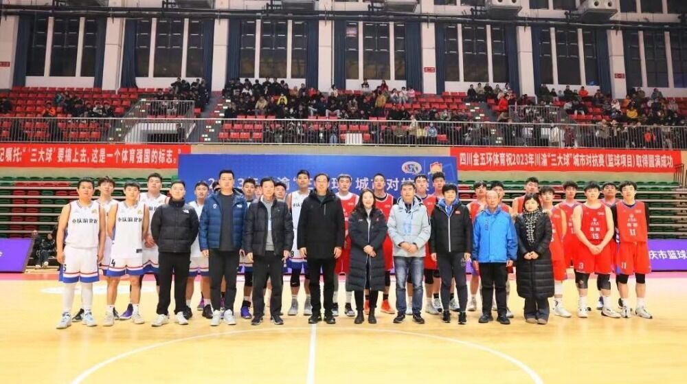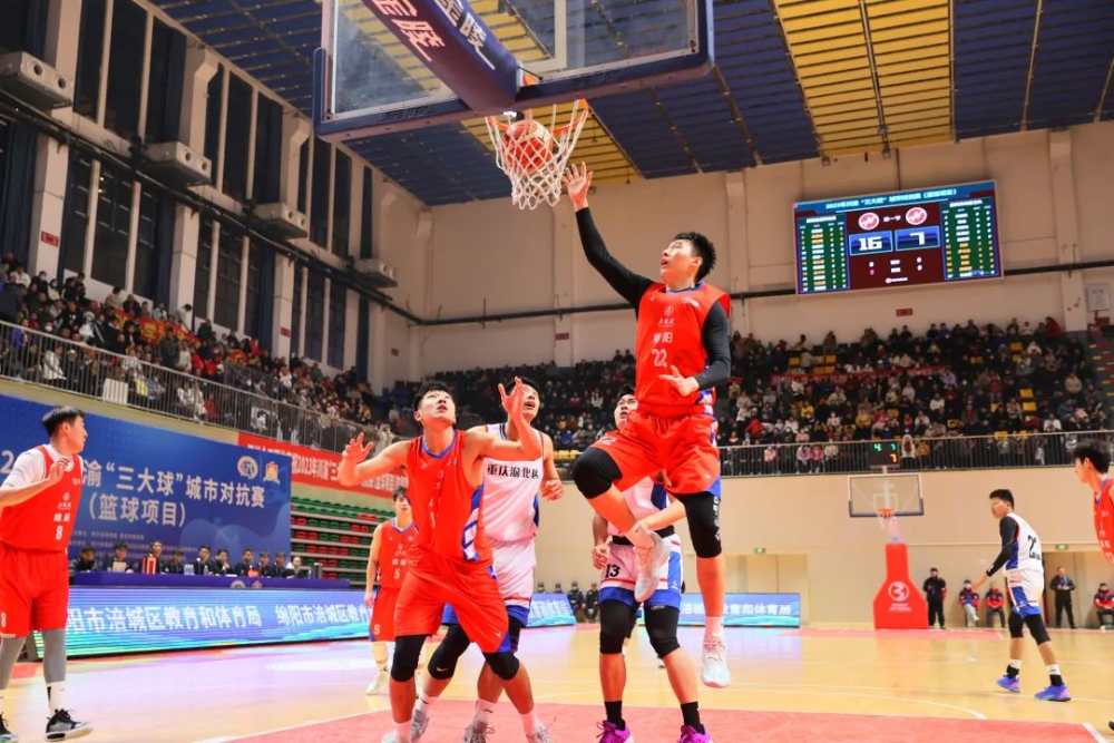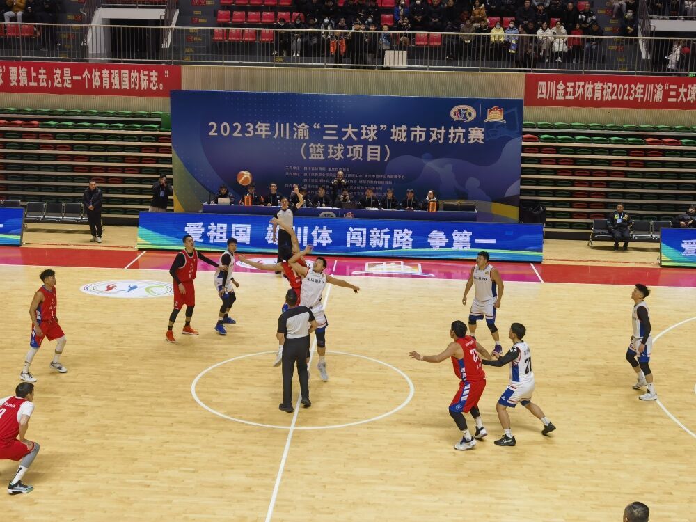 交流互促增友谊,川渝共绘新“篮”图。12月23日,2023年川渝“三大球”城市对抗赛(篮球项目)在四川省绵阳市涪城区体育馆举行。