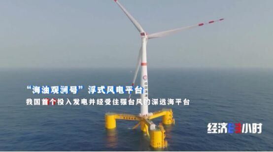 距离海南文昌海岸线136公里的海洋深处,“海油观澜号”浮式风电平台迎风挺立。这是我国第一个投入发电并经受住强台风的深远海风电平台,于今年5月份并网发电。