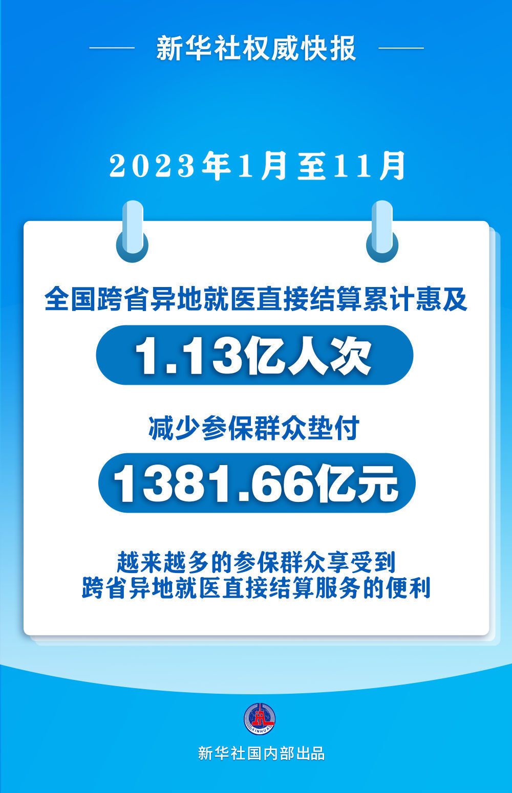 记者12月29日从国家医保局获悉,2023年1月至11月,全国跨省异地就医直接结算累计惠及1.13亿人次,减少参保群众垫付1381.66亿元。截至2023年11月底,全国联网定点医药机构达到52.31万家,较2022年底增长60.02%。