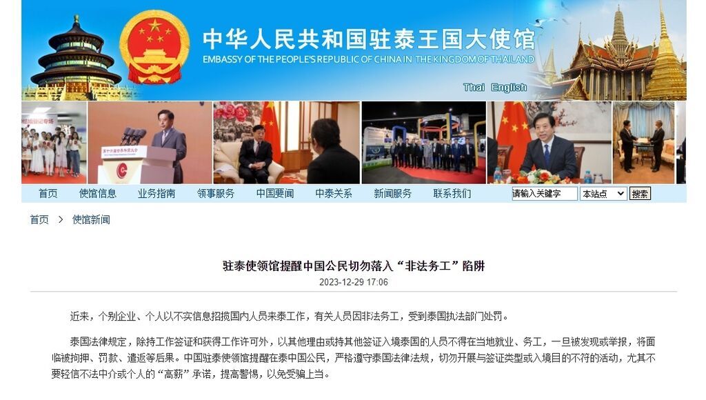 中国驻泰国大使馆29日发布提示称,近来,个别企业、个人以不实信息招揽国内人员来泰工作,有关人员因非法务工,受到泰国执法部门处罚。