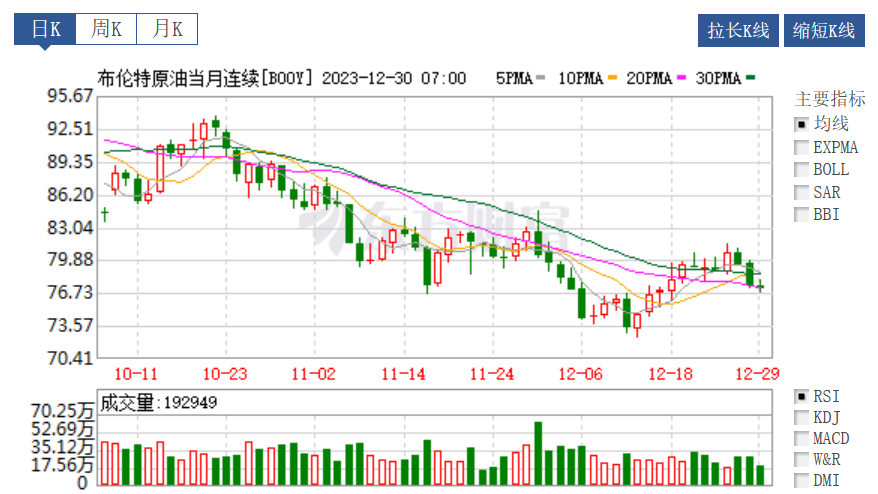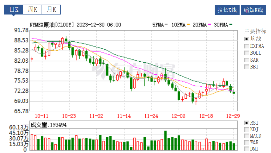 截至12月29日当天收盘,纽约商品交易所2月交货的轻质原油期货价格下跌0.12美元,收于每桶71.65美元,跌幅为0.17%;3月份交货的布伦特原油期货价格当日下跌0.11美元,收于每桶77.04美元,跌幅为0.14%。