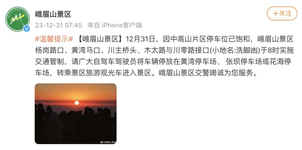 峨眉山景区今日门票已售罄 中高山片区停车位已饱和