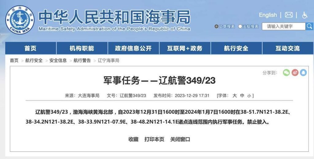 据中国海事局网站消息,大连海事局发布航行警告,自2023年12月31日16时至2024年1月7日16时,渤海海峡黄海北部部分海域执行军事任务,禁止驶入。