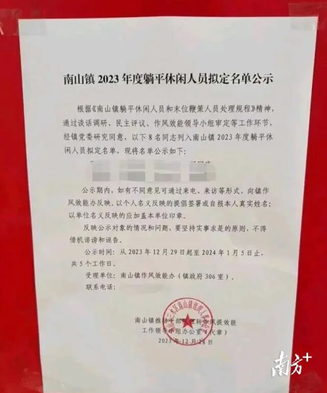 近日,广东省佛山市三水区南山镇发布《南山镇2023年度躺平休闲人员拟定名单公示》,引起广泛关注。公示显示,根据《南山镇躺平休闲人员和末位鞭策人员处理规程》,通过谈话调研、民主评议、作风效能领导小组审定等工作环节,经南山镇党委研究同意,8名同志列入南山镇2023年度躺平休闲人员拟定名单。