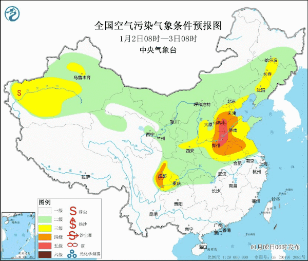 元旦假期后期,大雾天气有所减弱,昨天下午大雾预警降级为黄色,不过昨夜到今晨,四川成都等局地仍然出现了特强浓雾。今天中午前后,四川盆地、华北平原等地大雾减弱消退,但华北等地的霾天气还在持续,河北中南部、河南北部、山东西部部分地区仍有重度空气污染。