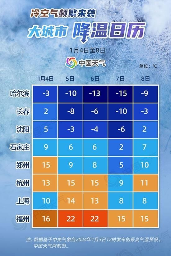 从这份大城市降温日历来看,5日开始,受冷空气影响,降温将自北向南展开,东北地区降温最猛且连降三天,沈阳、长春的最高气温将重回冰点之下。近期已成为旅游热门地的哈尔滨,降温最为猛烈,6日至7日,最低气温将在-25℃左右,最高气温跌至近期低点,达-15℃左右,天寒地冻一整天。近期有计划去当地游玩的南方小伙伴们,一定要带好厚衣服,户外活动帽子、手套、雪地靴从头到脚捂严实。