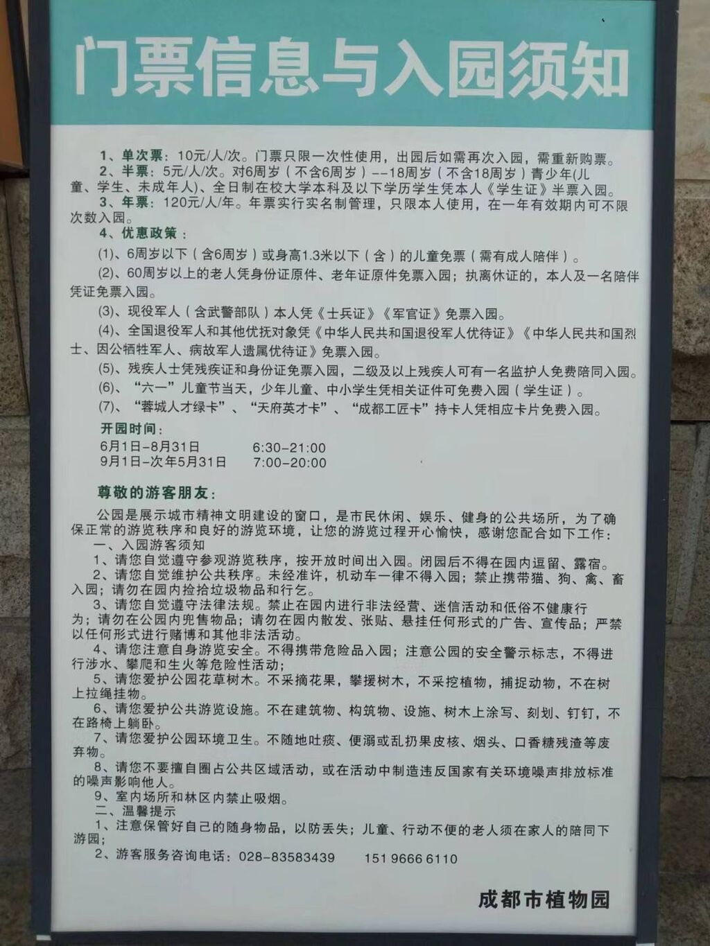 “请您爱护公园花草树木。不采摘花果,攀援树木,不采挖植物,捕捉动物,不在树上拉绳挂物。”在成都市植物园入口处,记者看到明显提示——请游客文明游园,不得采摘植物花果。