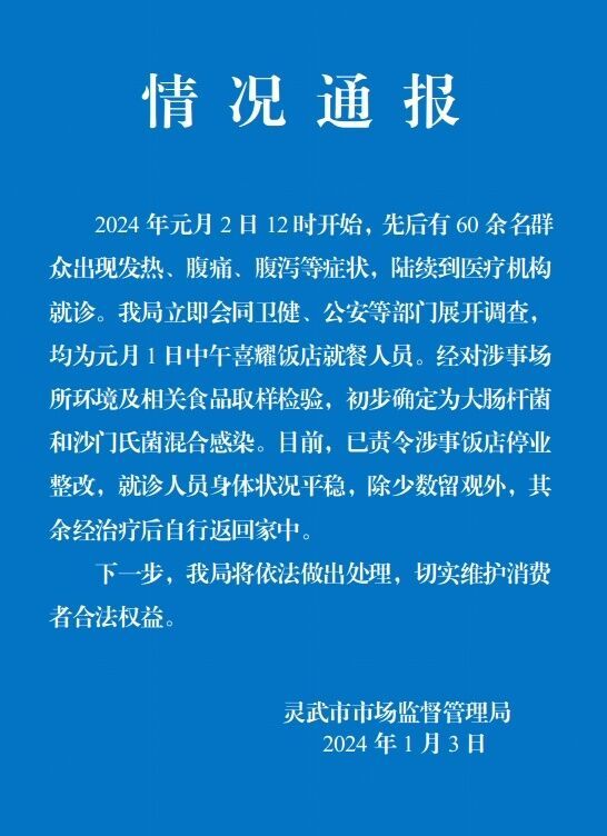 宁夏灵武市市场监督管理局发布最新情况通报,2024年1月2日12时开始,宁夏灵武市先后有60余名群众出现发热、腹痛、腹泻等症状,陆续到医疗机构就诊。灵武市市场监督管理局立即会同卫健、公安等部门展开调查,均为1月1日中午在本地喜耀饭店就餐人员。经对涉事场所环境及相关食品取样检验,初步确定为大肠杆菌和沙门氏菌混合感染。目前,已责令涉事饭店停业整改,就诊人员身体状况平稳,除少数留观外,其余经治疗后自行返回家中。