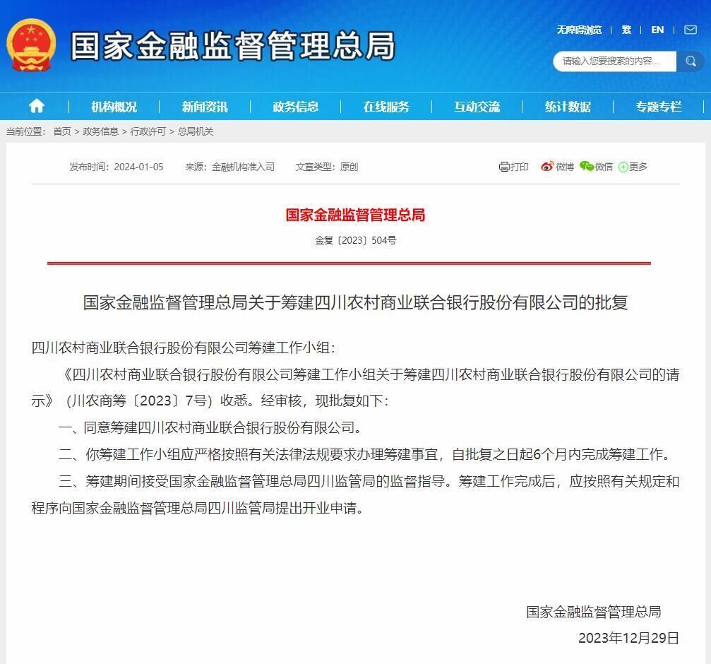 1月5日,记者从国家金融监督管理总局官网获悉,四川农村商业联合银行股份有限公司获批筹建。