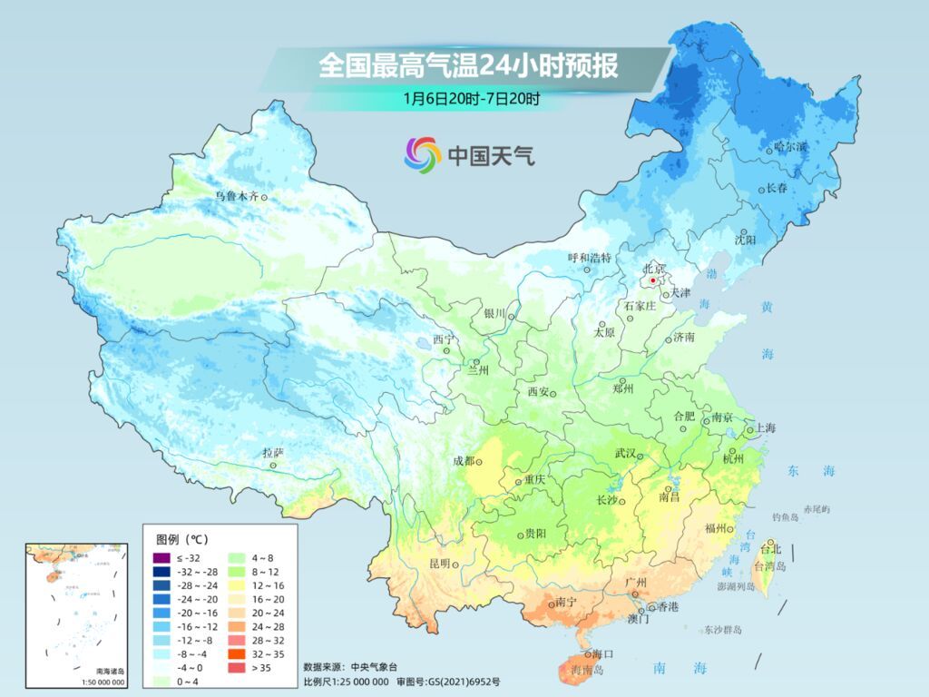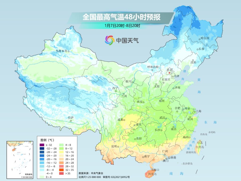 大城市中,像是沈阳,明天最高气温将下降到-9℃,较常年1月上旬的-4.9℃明显偏低。北京、天津明天最高气温都将下降到1℃,南京、上海最高气温将下降到不足10℃。