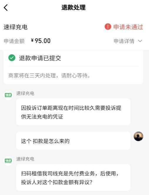 2023年12月初,周先生联系速绿充电在线客服,发现无人工回复,于是通过支付页面发起投诉并对该笔扣款提出质疑。商家回复:“扫码租借我司线充是先付费业务,后使用,投诉人对这个扣款金额有异议?”周先生再次提交投诉并申请退款,结果以失败告终。