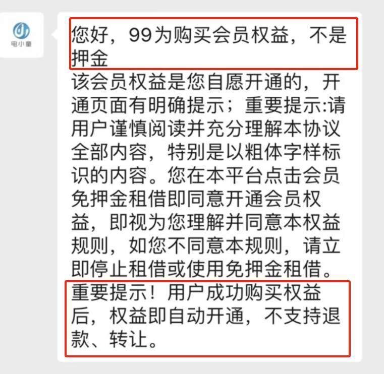 记者从电小童在线客服回复冯女士的对话中看到,客服称:“99元为购买会员权益,不是押金,该会员权益是您自愿开通的,开通页面有明确提示……用户成功购买权益后,权益即自动开通,不支持退款、转让。”
