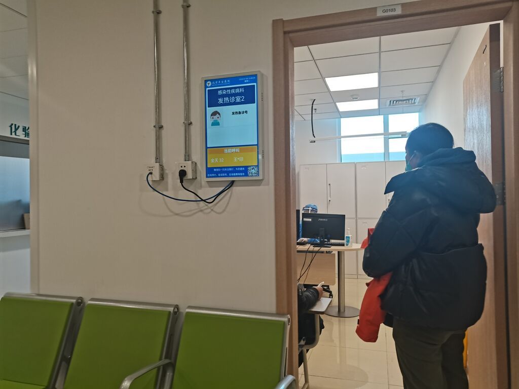 1月9日下午,在北京丰台区医院发热门诊,患者王女士在门诊室外等待候诊。她说,目前自己体温是38度多,浑身无力,从检查结果来看,她患了乙流。