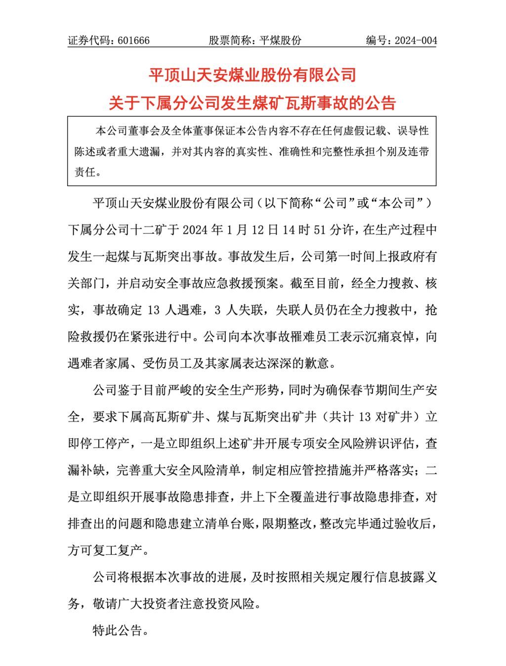 1月14日,上交所官网发布“平煤股份关于下属分公司发生煤矿瓦斯事故的公告”,公告披露,事发于1月12日的河南平顶山煤矿事故已致13人遇难,3人失联。全文如下: