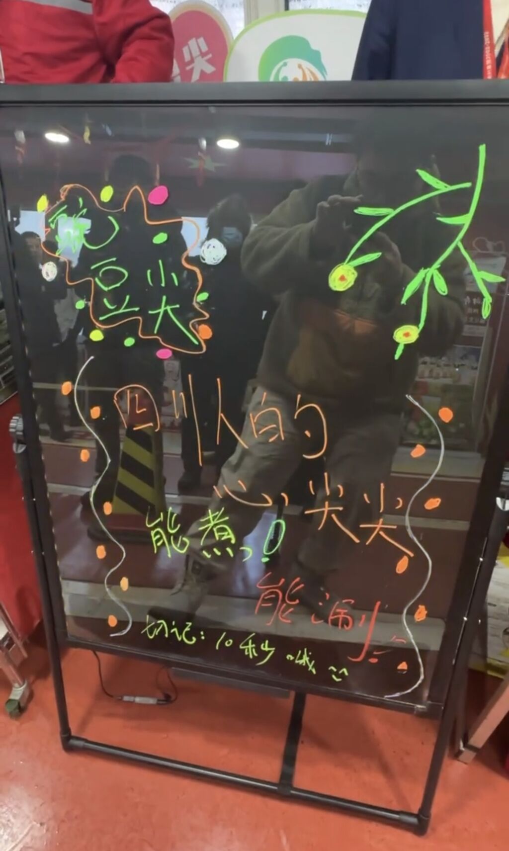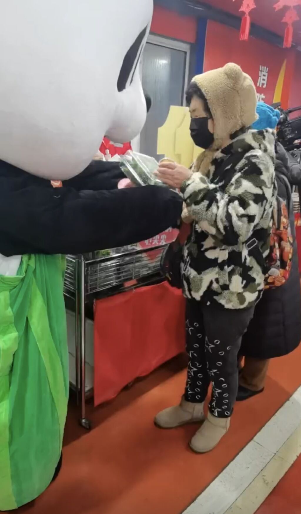 四川文旅吉祥物“安逸熊猫”大玩偶热情拥抱在排队的市民,满满的温暖和爱充斥着整个活动现场。不仅如此,现场还支起了一口火锅,工作人员热心地帮助居民解锁豌豆尖的N种吃法,“可以涮羊肉,10秒就可以吃!可以炒着吃,也能下到火锅里,豌豆尖是四川火锅中必备的特色蔬菜”