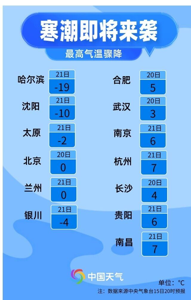 预计19-23日,中东部大部地区将有5~6级偏北风,气温将下降6~9℃,其中内蒙古中部、陕西北部、华北西部和北部气温下降10~18℃;气温0℃线将南压至南岭一带。