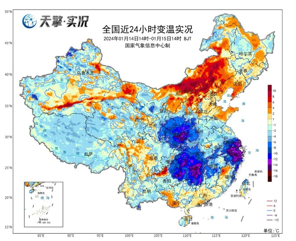 昨天开始,冷空气终于又有所行动了,内蒙古、吉林到江南北部普遍出现降温。今天,冷空气叠加阴雨雪,浙江、湖南、陕西、河南、山西等地部分地区降温超过了10℃。