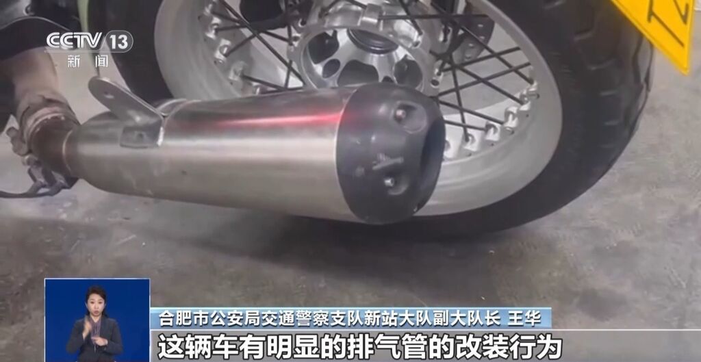 合肥市公安局交通警察支队新站大队副大队长 王华:经核查以后这辆车有明显的排气管改装行为,噪声很大。我们按照法律规定,依法对改装车进行暂扣,对改装的违法行为依法查处。