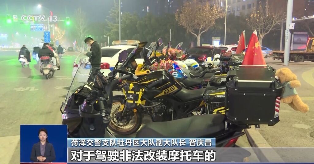 1月14日晚上,山东菏泽交警联合当地市场监督监管局、交通运输局等执法部门对这一违法行为再次开展集中治理,不到半个小时的时间,就查获多辆非法改装的大功率摩托车。
