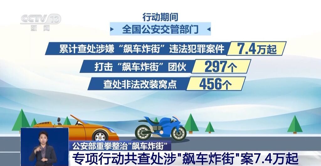 2023年5月至11月,公安部部署全国开展打击整治飙车炸街违法犯罪专项行动,数据显示,行动期间,全国公安交管部门累计查处涉嫌“飙车炸街”违法犯罪案件7.4万起,打击“飙车炸街”团伙297个,查处非法改装窝点456个,部分省份飙车炸街类警情同比下降了50%以上。