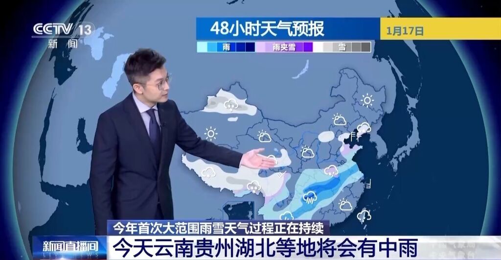 中国气象局气象分析师 胡啸:从降雪的角度来讲,今天强度会有所减弱,但是降雪将会逐渐北抬。华北一带地区,也有可能出现雨夹雪或者是小雪的天气,而降雨将会进入到核心时段,今天在云南、贵州一直到重庆、湖北等地将会有中雨,部分地区还会有大雨,在明天、后天整体的降水逐渐东移南压,降雨的持续时间还是很长的。城市当中,以武汉为例,从周二到周五几乎是天天都会下雨。除此之外,我们也需要关注冻雨的影响,在今天,陕西的南部地区以及湖北西北部,要谨防道路结冰可能造成的影响。这一轮大范围的雨雪天气过程将会持续到19日,届时高空槽逐渐东移南下,从19日开始到23日,我们国家将会经历一股寒潮天气的影响,气温将会明显下降。提示在21日前后,西南地区的东部和江南等地也有可能会有大范围的雨雪天气出现。在即将到来的大寒节气,我们将会在寒冷中开场。