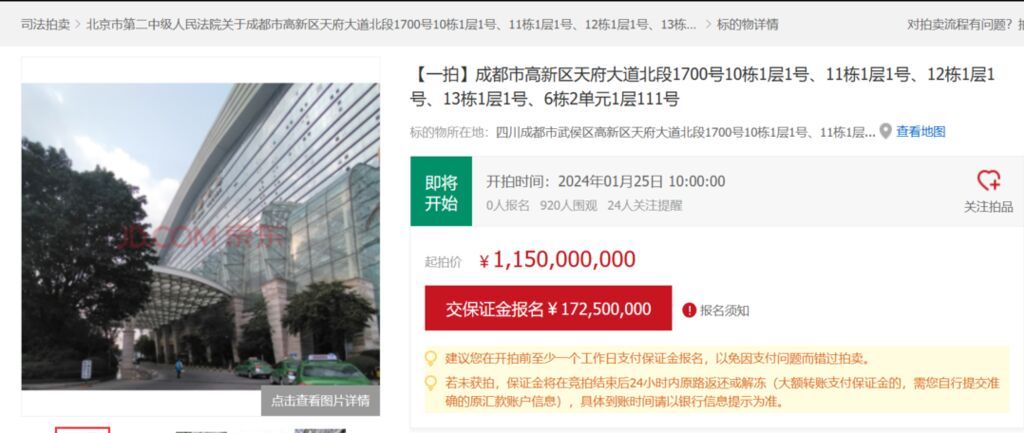 1月18日,京东拍卖官网显示,北京市第二中级人民法院将对成都环球中心部分房产进行司法拍卖,评估价16.90亿元,起拍价11.5亿元,相当于打了七折。